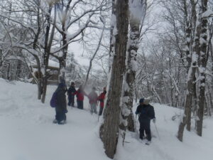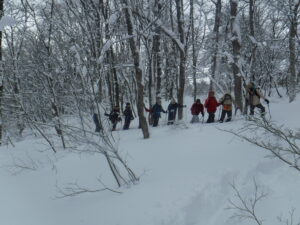 ふかふかの新雪が、昨日が約20㎝今日が20cmと降り積もり、深雪ラッセルのため予定していたルートを歩くのを断念し、ビジター裏山のうさぎ森の雪上観察会に切り替え実施した。