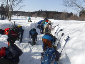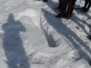 前日の夜は動物たちが騒いで足跡がいっぱい残っていることを期待してましたが、残念、雪が固雪だったので動物たちの足跡を見つけることができなかったけど、キツネがハンティングした場所(鳥の羽が散乱、鳥はヤマドリの雌)があって、皆で検視官になったつもり、何の鳥が食べられたのか、どのように持って行ったのかと考えたりと楽しそうでした。