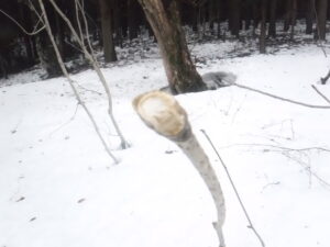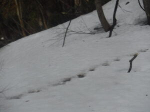 雪解けが早まって残雪おおよそ1mぐらい。スギ林の中を歩くと、イノシシの足跡や食痕、またウサギの姿は見られなかったが、皆さんの好きな山菜のコシアブラを食べた跡などがあったり、ここのブナも花芽が大きく膨らみ、もう少しで咲きますよと言わんばかり。今年は動物たちが食料に困らないかなと思いたいな。このエリアは、アップダウンあったり、里が見えたりと歩くには楽しいところです。ただ今年は残雪が少なくなっているので少し注意が必要ですが。