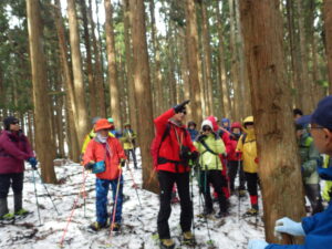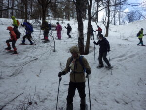 予報のとおり、雨降りのスノーシューかなと思っていましたが、なんと実施時間になると雨は止み、明るい空模様になって、意外に歩きやすくて予定通り荒沢寺周辺でスノーシューを楽しみました。