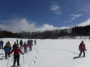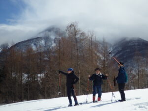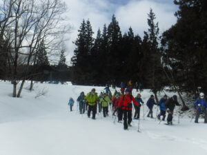 ときより青空が広がり(ちょっと雨も降りましたが)、接面の白と空の青のコントラストがきれい。その中を汗をかきかき、今まで体験していないルートと経験してこなかった急斜面を登ってきたグループもあり、雪解けが進む小沢には、ミズバショウの葉が少し見えたり、春を感じることができたスノーシューでした。