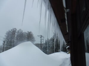 ようやくツララができました 2026年01月23日(金) ツララ この冬は、雫だけでツララになるほど冷えがありませんでした。 さすが大寒です。今シーズン初のツララ(約1.5m)が軒先に下がっています。このツララが落ちないと軒下の雪をどかすことができないけど、ツララの雫を求めて、小鳥たち水飲みに来ないかな。