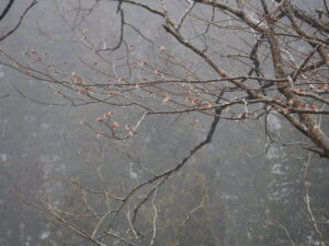 春の一歩目 2026年02月28日(土) マンサク ブナの花芽 2月中旬ごろからの、暖かな陽射しと、そして温かい雨とで一気に芽吹きが進み、今日ようやく開花しました。優しく雨の雫がマンサクの花を覆いつくしています。その隣では、ブナの花芽が大きく膨らみ、少し銀色の毛をまとった花が見えていました。